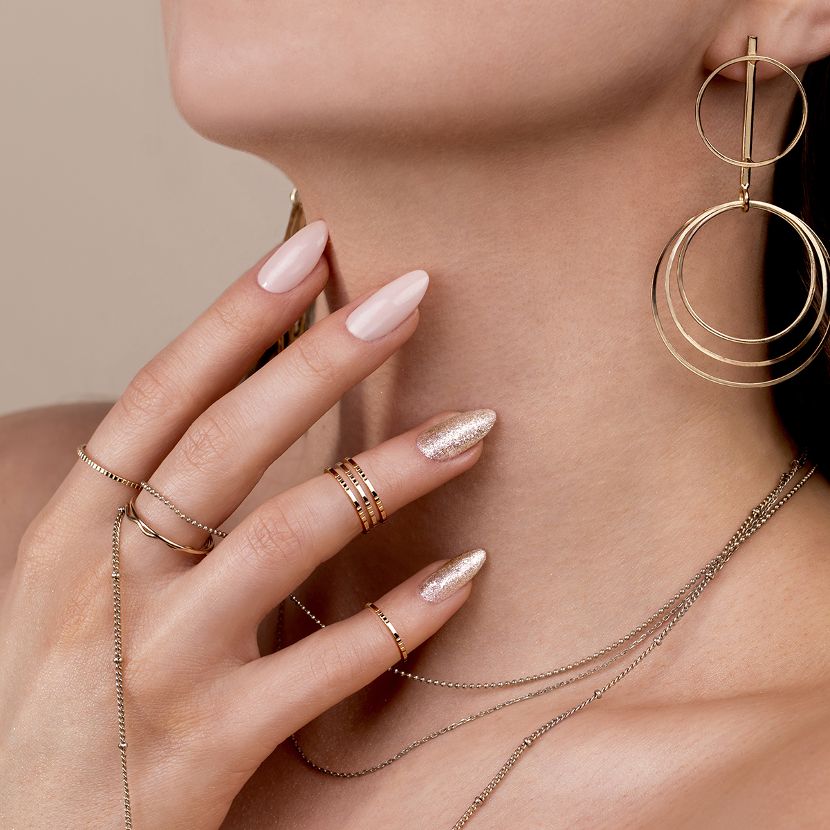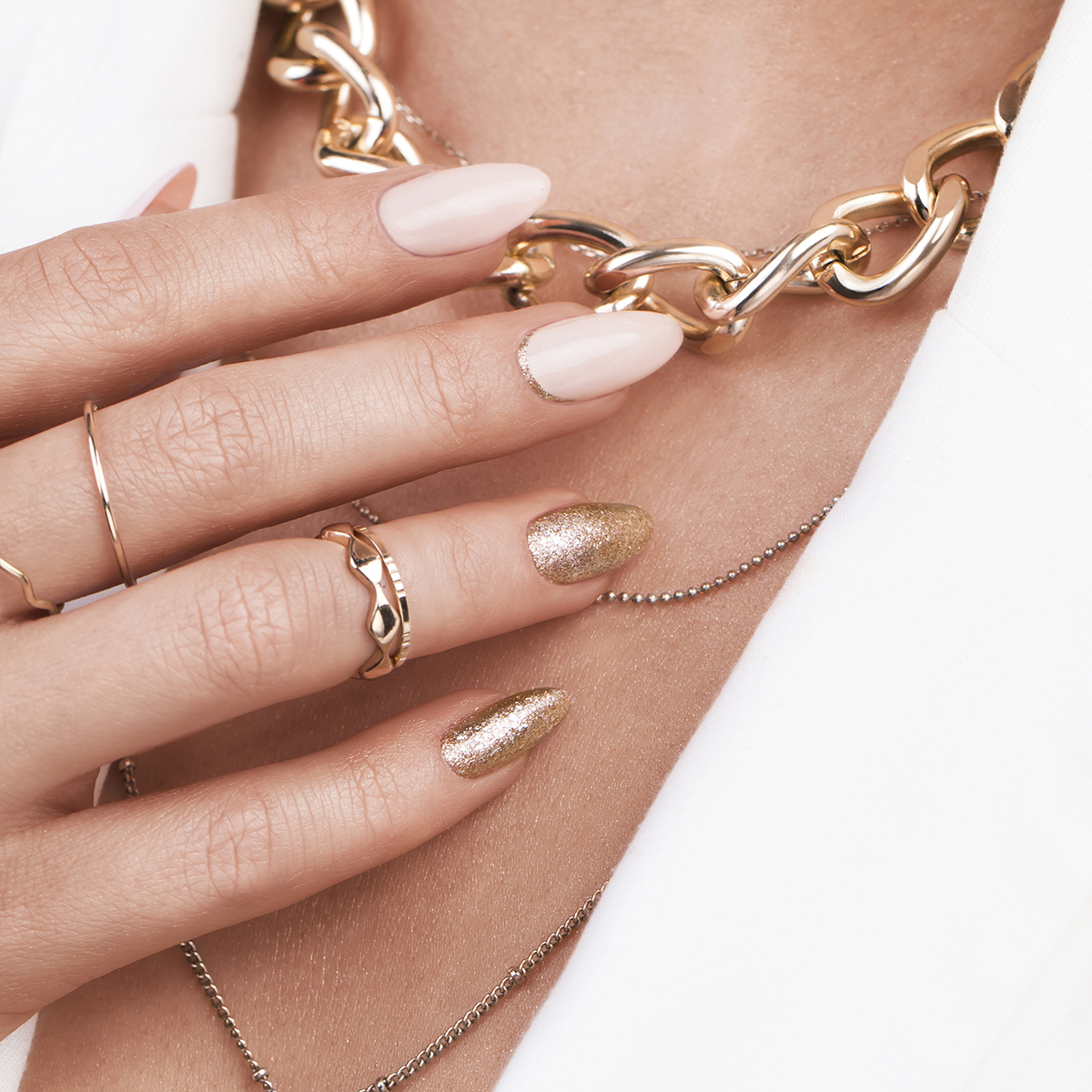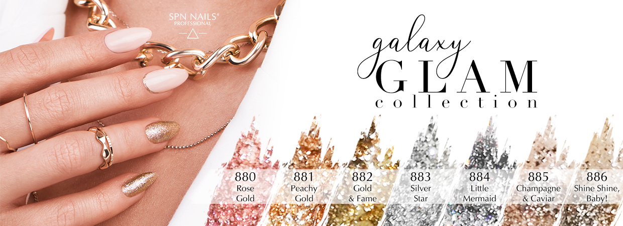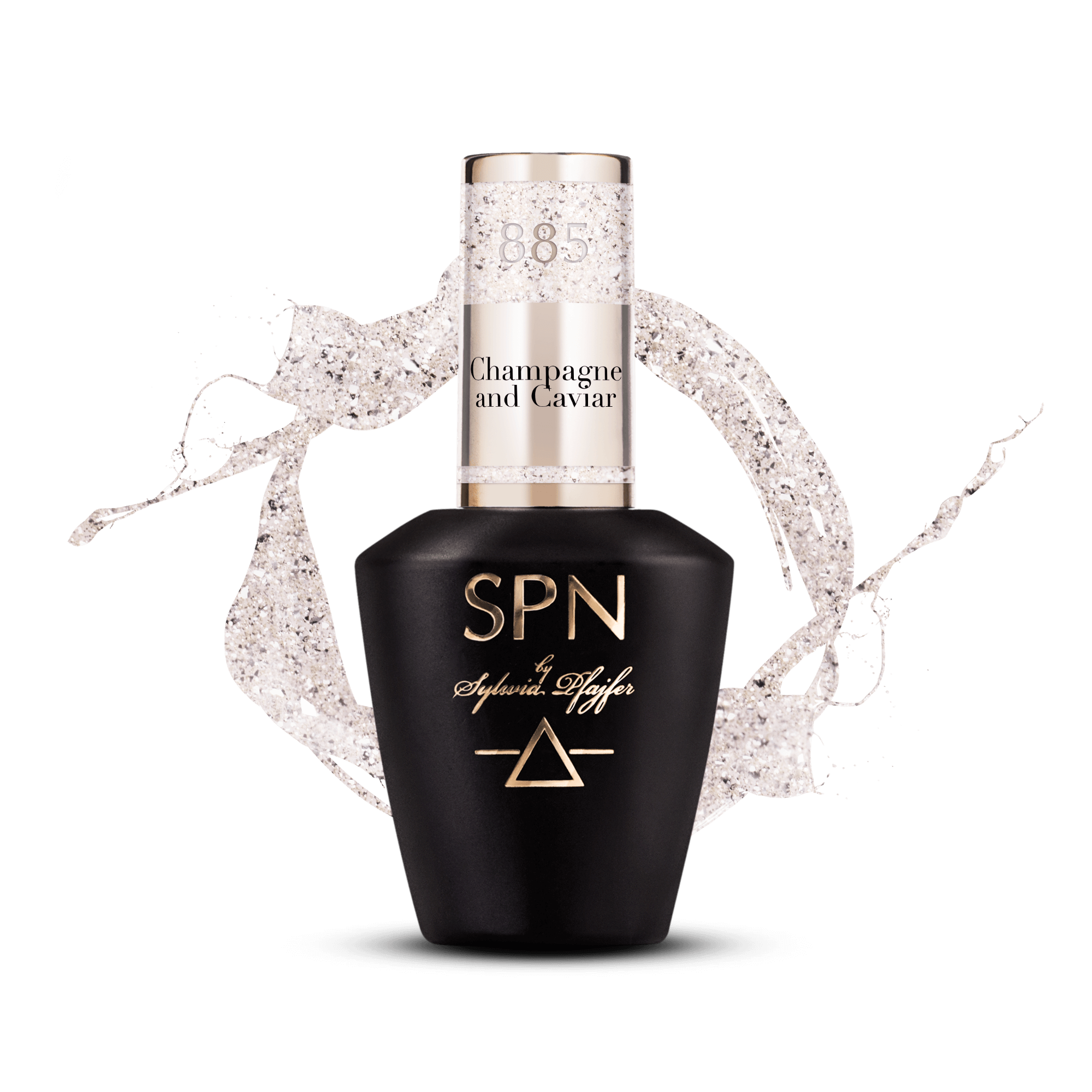 luxury and splendor on demand, regardless of the occasion. Express and complete your inner glow with a Champagne and Caviar shade. Choose sparkling glitter particles, bathed in delicately iridescent pink-gold varnish. You can also cover it with another gel polish and spice up your stylization.