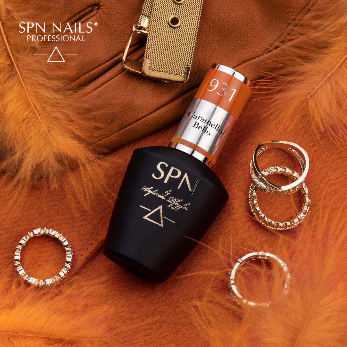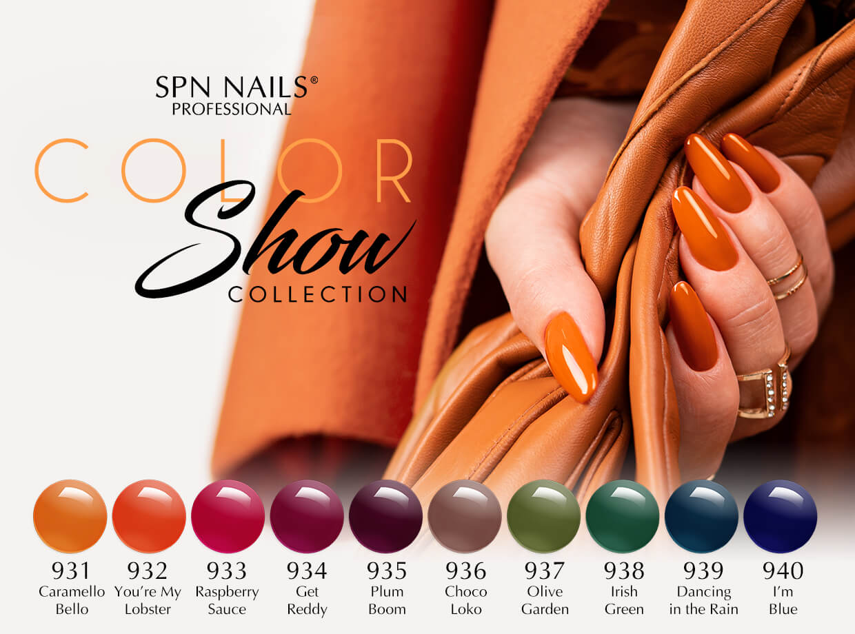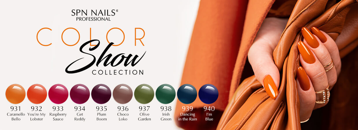 In our stylizations, we focus on warm colors: caramel, a sweet addition to your favorite coffee, which can be found in the 931 Caramello Bello gel polish, orange red, closed in the bottle of 932 You're My Lobster lacquer, a shade of ripe raspberry hidden in 933 Rasberry Sauce gel polish, or plum shade closed in 935 Plum Boom gel polish.