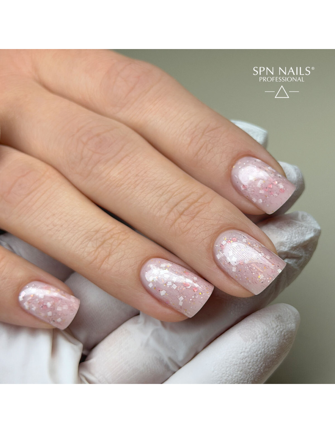 Funny Base - Funny #1 to pastelowy róż z domieszką białych i różowych geometrycznych drobinek, przeplatanych różowymi włóknami i delikatnie oprószony złotem.