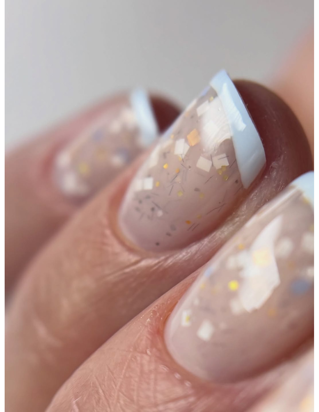 Funny Base - Funny #5 to beż z kropelką różu z domieszką białych, błękitnych i złotych drobinek, przeplatanych niebieskimi włóknami.