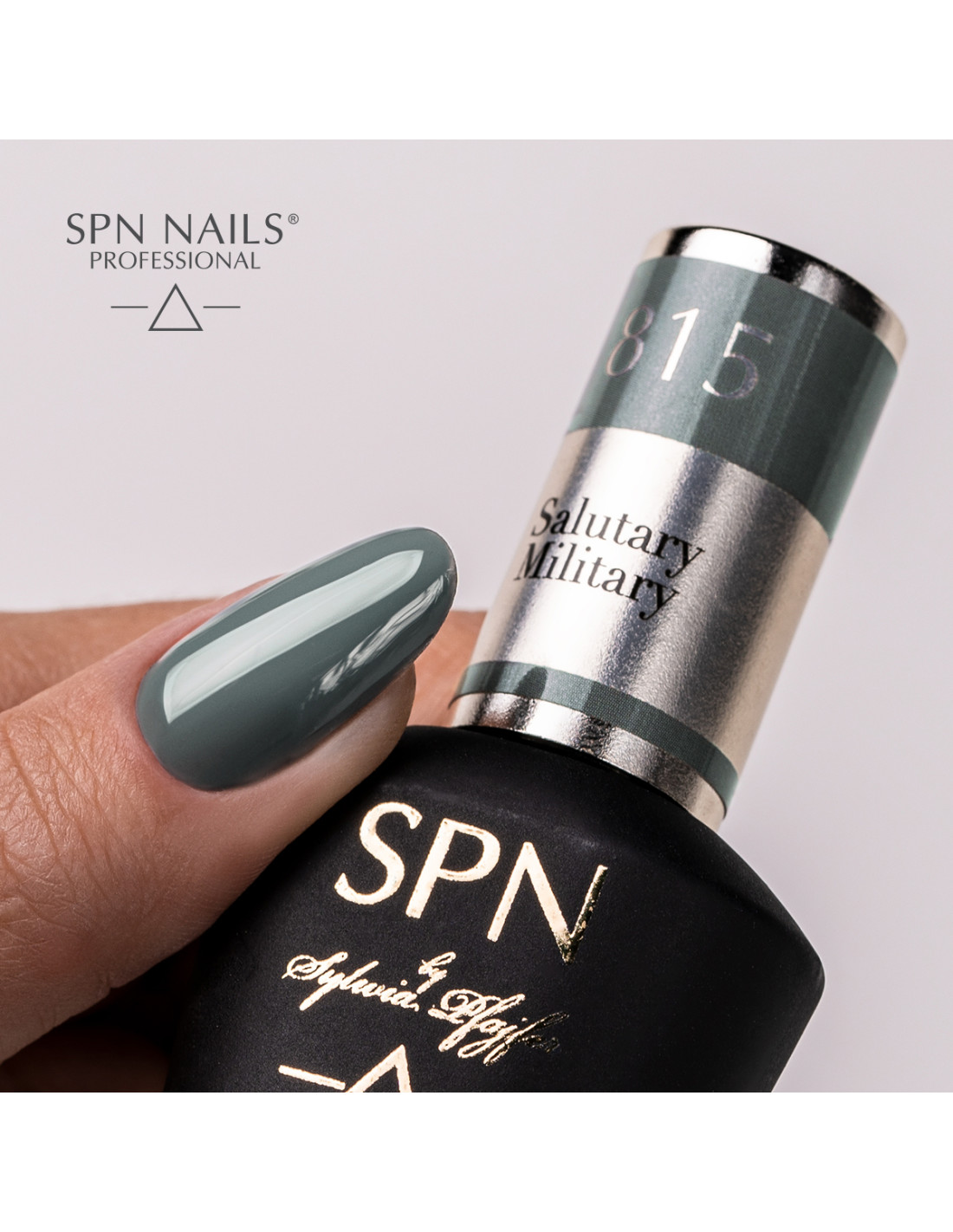 Hybryda Salutary Military to militarna, zgaszona zieleń. Spokojna, stonowana i wyjątkowo plastyczna w połączeniu z innymi odcieniami z palety kolorów SPN Nails.