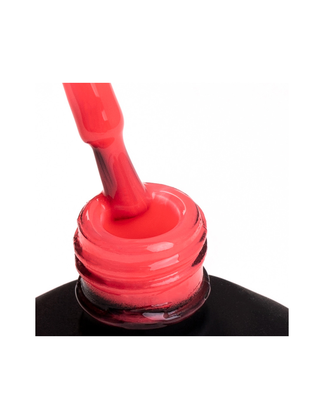 Fluorescencyjny lakier hybrydowy w ciągu dnia zachwyca wakacyjnym odcieniem intensywnego różu z kroplą koralu. W ciemności świeci na łososiowy kolor